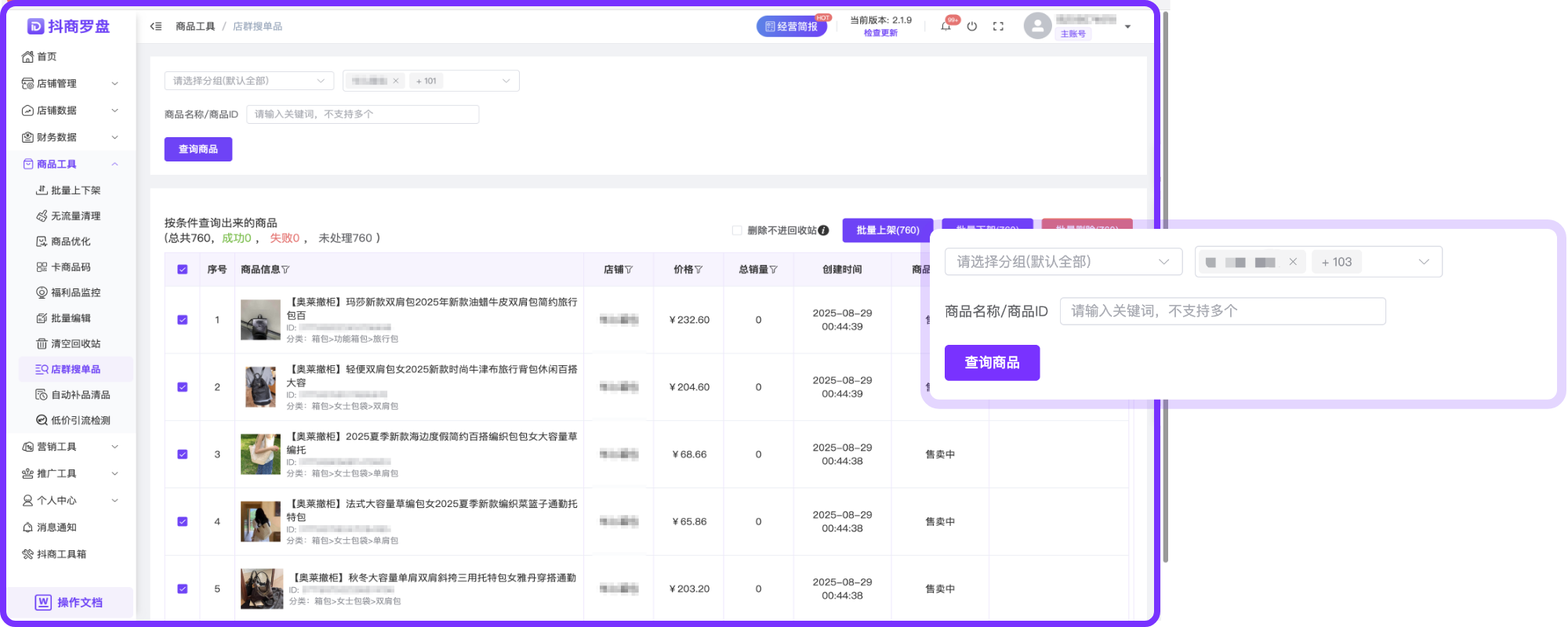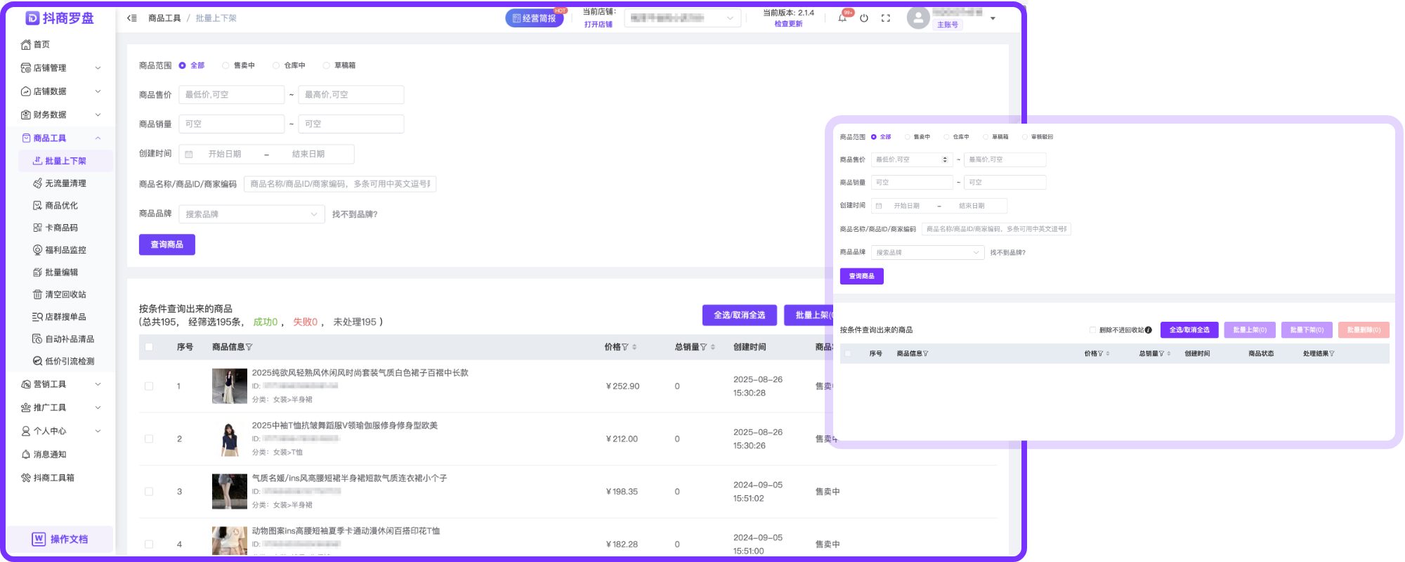 还在为逐个操作商品上下架耗时耗力头疼?商品批量上下架功能,帮你一键解决!支持多条件精准筛选,找品快人一步;批量操作,效率直接拉满;结果清晰可视,管理超省心!