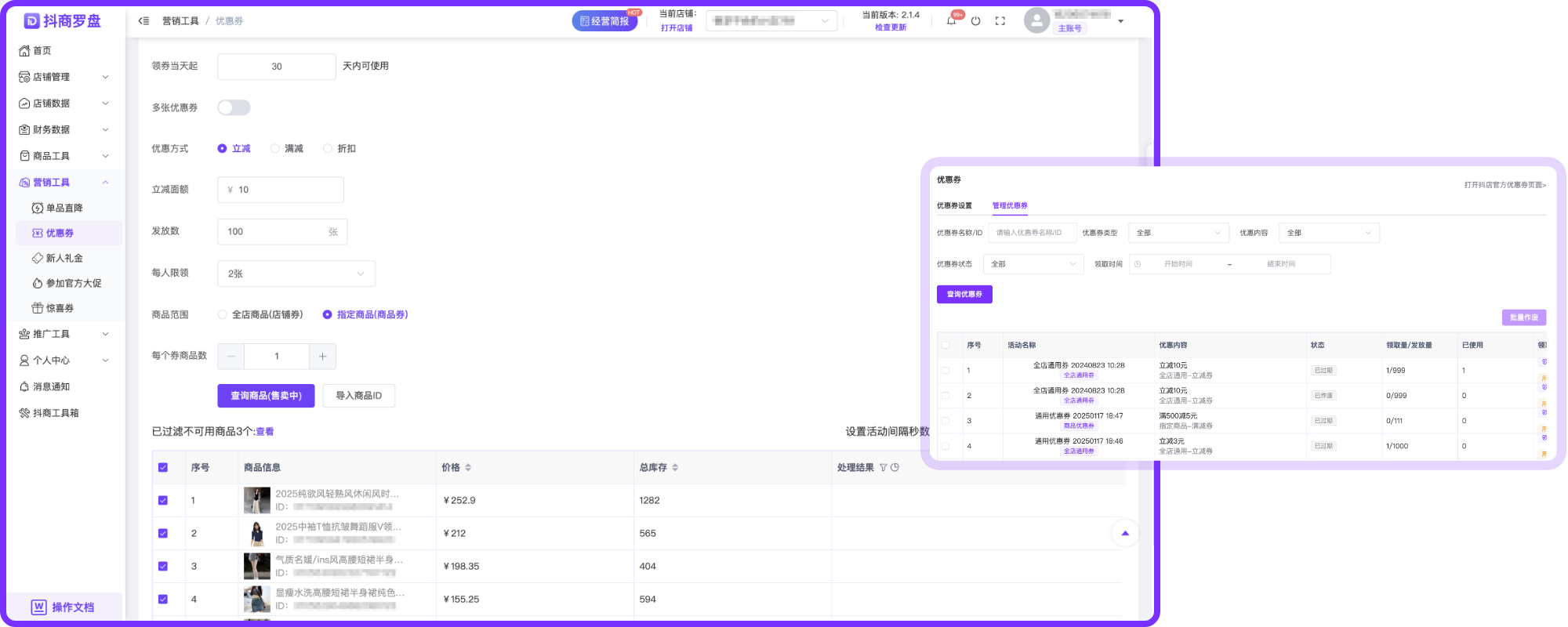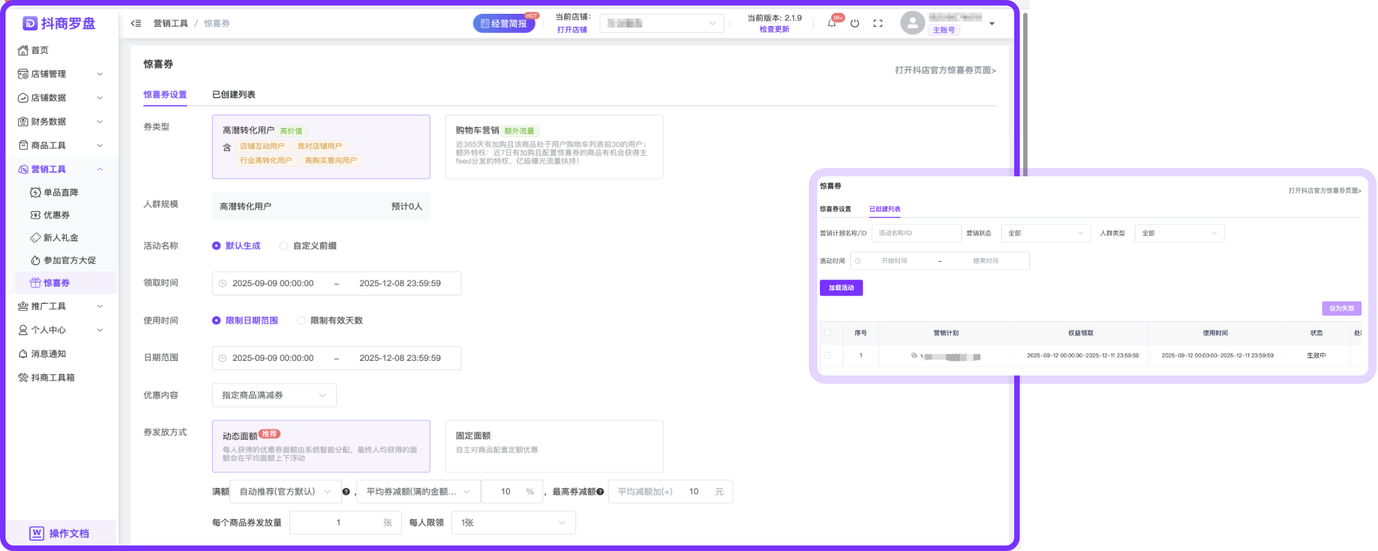 店群优惠券、单品直降、新人礼金创建情况